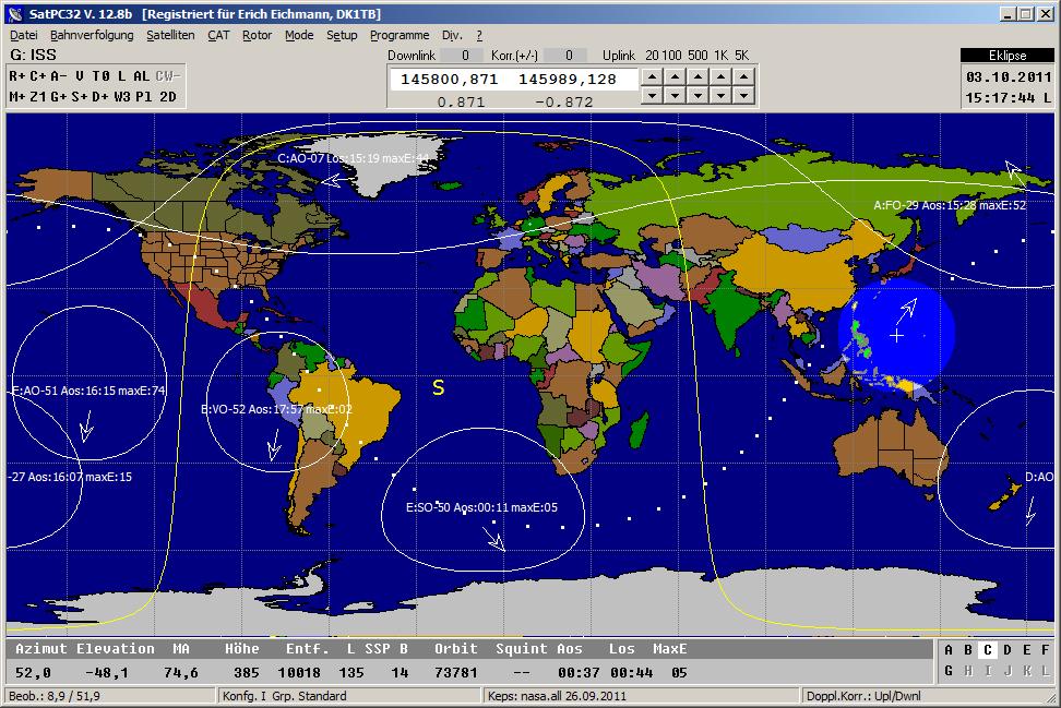 Satelliten innerhalb der Weltkarte ab und gibt die Ergebnisse in Textzeilen auf den