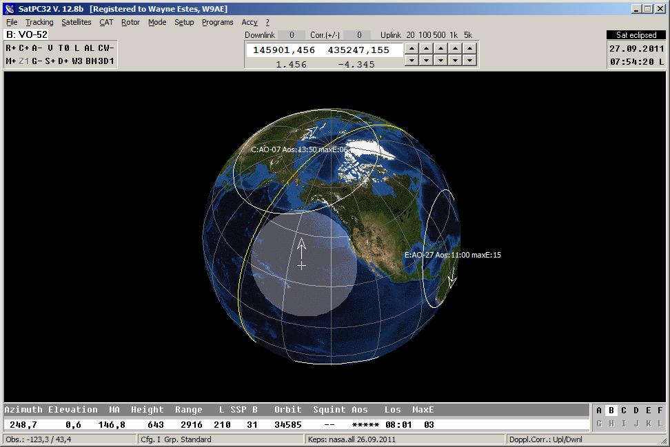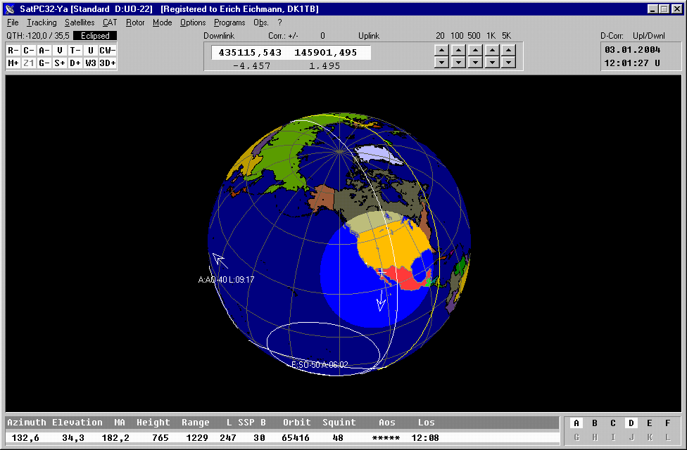This older screenshot shows the footprint of UO22 and other satellites on a 3D-view world map. UO-22