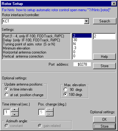 The screenshot shows the "Rotor Setup" window. All settings regarding rotor steering can be done in this window. All rotor interfaces/controllers supported by SatPC32 can be chosen from a list which opens when the user clicks the control left of the button "Search" in the upper section of the window.