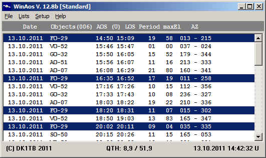 WinAos generates lists that show all passes of one or several selected satellites in chronological order. The lists can be generated for a selectable period. They show the rising and setting times, period, max. elevaton and azimut angles at rising and setting times. The lists can be printed or stored in a file. Clicking on a satellite name will highlight all passes of that satellite.